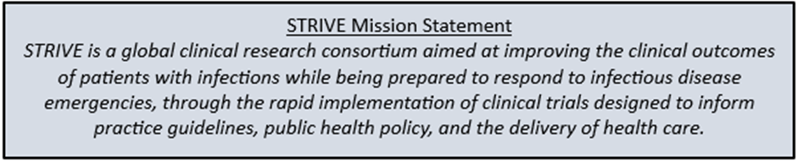 The STRIVE network was established in 2022 in recognition of the need for a sustainable highly trained global clinical trials network prepared to conduct rigorous clinical trials evaluating therapies for pathogens able to cause infectious emergencies.